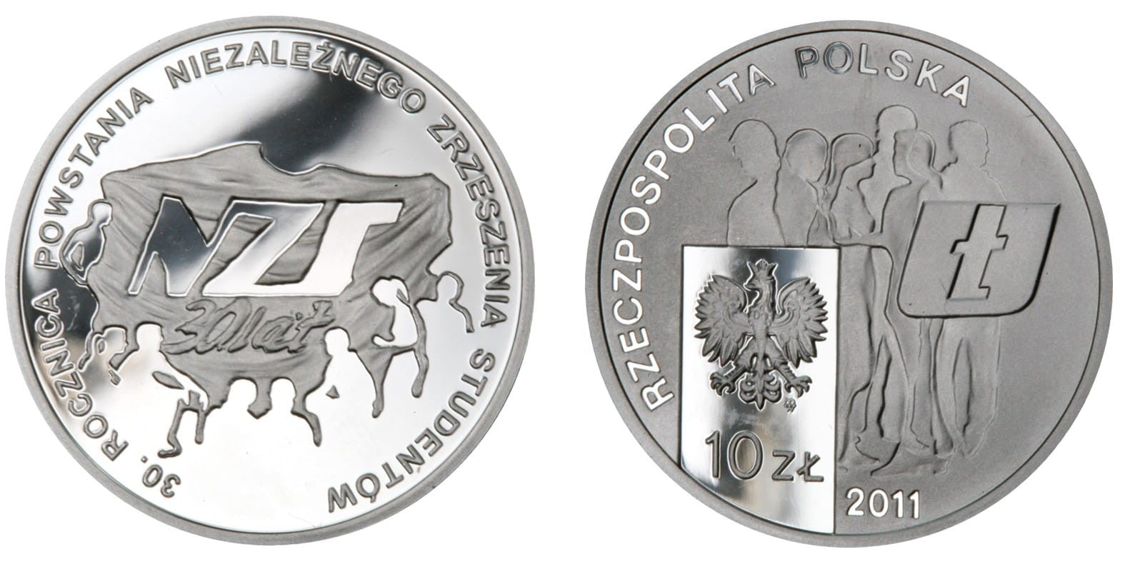 Awers: Z lewej strony, na wyodrębnionej płaszczyźnie, wizerunek orła ustalony dla godła Rzeczypospolitej Polskiej, a pod nim napis: 10 ZŁ. Po prawej stronie orła, u dołu, oznaczenie roku emisji: 2011. Centralnie, stylizowane wizerunki sześciu postaci. Na ich tle, z prawej strony, wizerunek logo Uniwersytetu Łódzkiego. U góry, półkolem napis: RZECZPOSPOLITA POLSKA. Pod lewą łapą orła znak mennicy: MW.