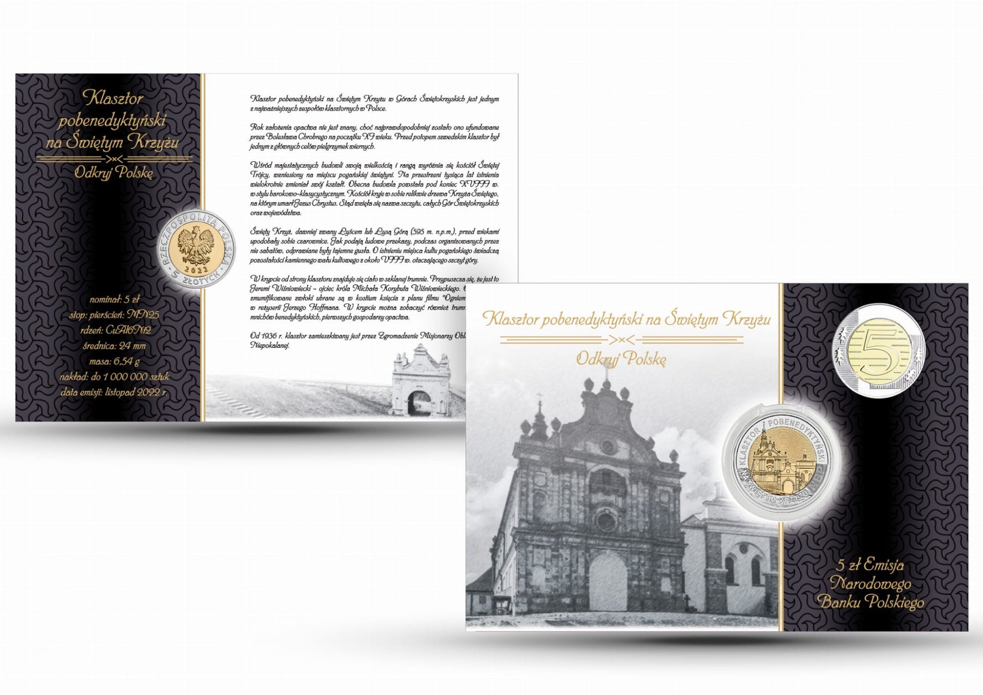 rewers: Centralnie, na wyodrębnionej płaszczyźnie w kształcie koła, wypełnionej falistymi liniami, wizerunek bramy oraz fragmentów zabudowań klasztoru pobenedyktyńskiego na Świętym Krzyżu od strony wschodniej. W otoku, u góry półkolem napis: KLASZTOR POBENEDYKTYŃSKI oraz u dołu półkolem napis: NA ŚWIĘTYM KRZYŻU. Z prawej strony, pomiędzy napisami w otoku, wyodrębnione pole, na którym w zależności od kąta patrzenia jest widoczny napis: NBP albo rok: 2022.