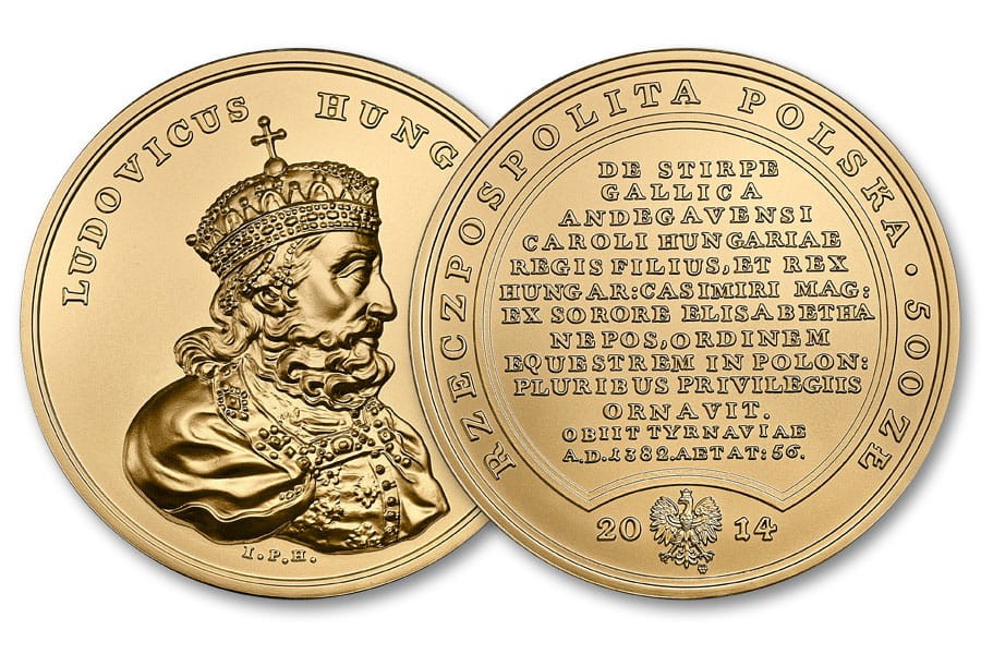 AWERS: W centralnej części monety czytamy w tłumaczeniu: „Z rodu francuskiego, syn Karola Andegaweńskiego, króla Węgier, król węgierski, Kazimierza Wielkiego z siostry Elżbiety siostrzeniec, stan rycerski w Polsce wielu swobodami ozdobił. Umarł w Trnawie Roku Pańskiego 1382, mając lat 56, panując w Polsce lat 12, dnia 12 września”. Wzdłuż otoku – napisy: RZECZPOSPOLITA POLSKA i nominał: 500 zł. W dolnej części monety – rok emisji: 2014 oraz miniaturowy wizerunek orła białego.